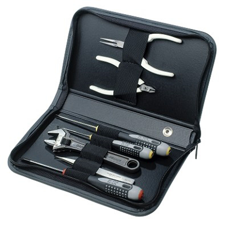 Qualitativ hochwertiger Satz mit verschiedenen Seitenschneidern, Zangen, Schraubendrehern, Pinzetten und Rollgabelschlüssel. In Tasche mit Reissverschluss.