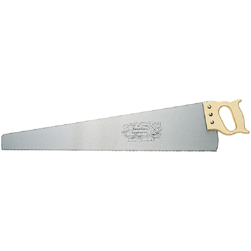 Musik-Säge. Poliertes Sägeblatt mit flachem Rücken und ungeschliffenen Zähnen. Gesamtlänge inklusive Holzgriff: 870 mm.