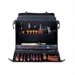 Werkzeugtasche für Elektriker, 28teilig. Sortierte Werkzeuge speziell für Installations- und Reparaturarbeiten. Kunstledertasche mit Metallbeschlägen, Bodenplatte Metall und flexiblem Öffnungssystem. Schneller Zugriff auf jedes Fach.