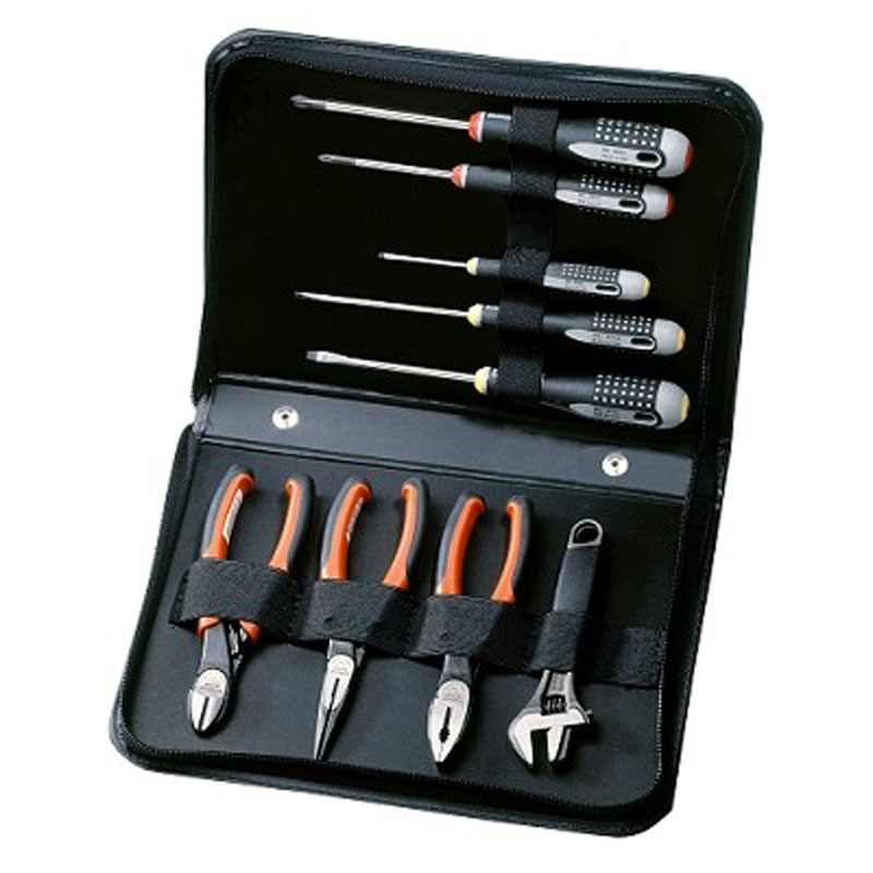 Qualitativ hochwertiger Satz mit verschiedenen Seitenschneidern, Zangen, Schraubendrehern, Pinzetten und Rollgabelschlüssel. In Tasche mit Reissverschluss.